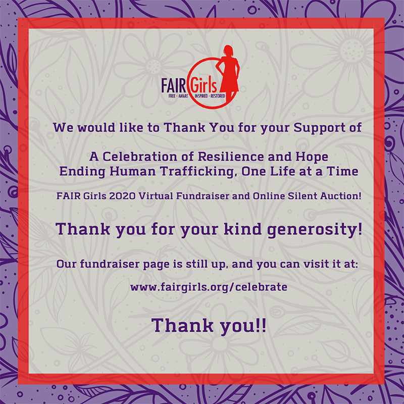 Thank you for your kind support of A Celebration of Resilience and Hope, Ending Human Trafficking One Life at a Time – our very first Virtual Fundraiser and Online Silent Auction!