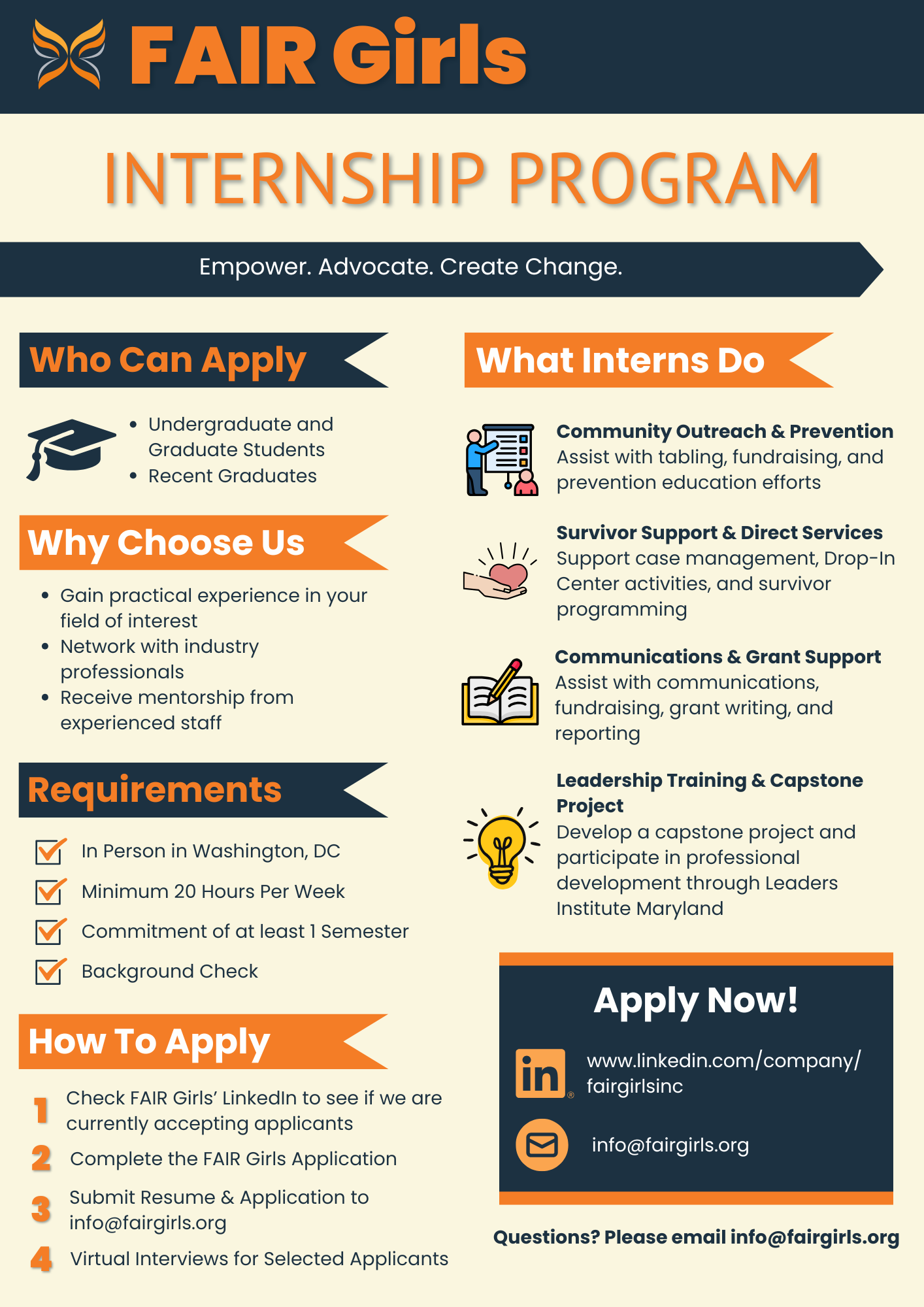 Please refer to the How to Apply steps in the infographic below and complete the Internship Application to apply.